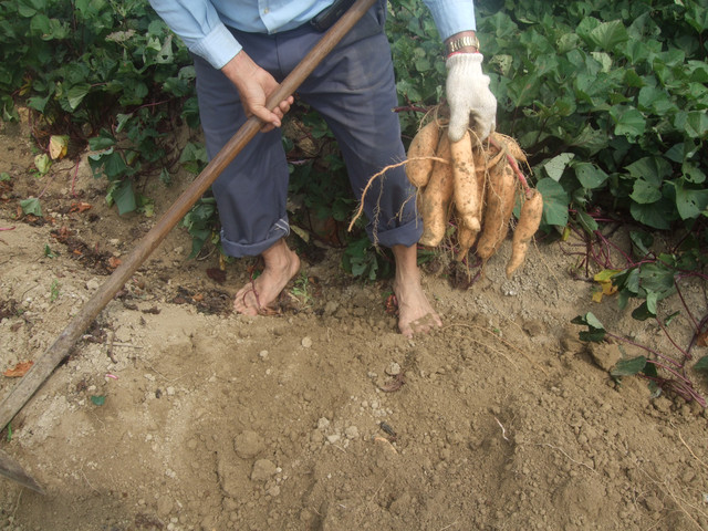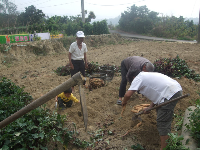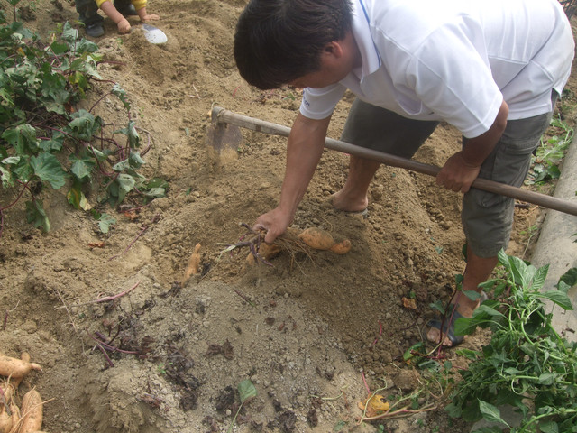 拿起鋤頭,把土挖鬆~看到埋在地底的地瓜了沒?