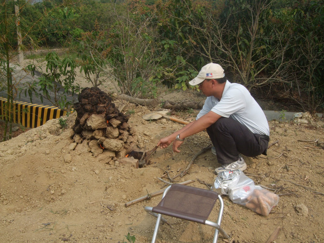 等到土窯燒紅之後,又默默的把要烤的東西丟入土窯,又默默的拿起鉛筆挖土埋起來....