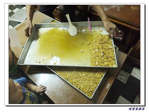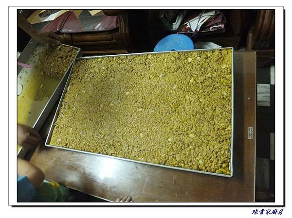 傳統一般農家做破布子餅的時候,是用碗裝破布子抹鹽凝結成塊再放涼之後冷凍,我們小時候做的破布子餅都是碗狀裝的!是這幾年懶得一碗一碗這樣處理,才請來大烤盤這樣弄成大餅狀的。