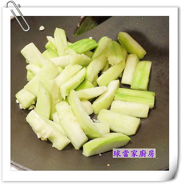 鍋熱後,蒜末炒香後,就把絲瓜下鍋炒。因為已經去掉瓜囊了,所以不容易出水。等到炒到絲瓜外表有點黃之後就可以加入蛤蠣囉!