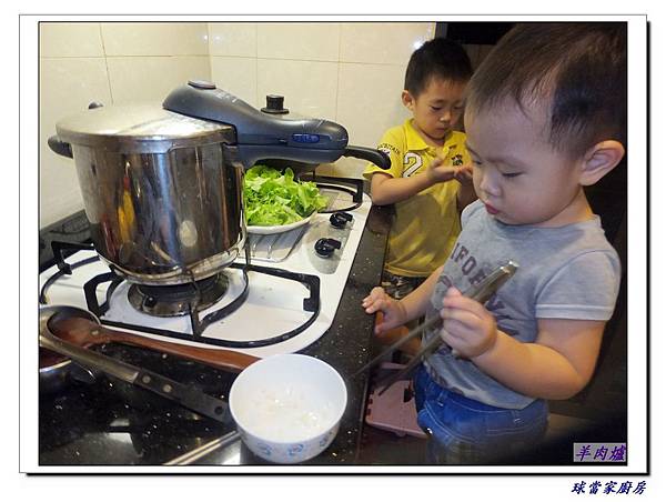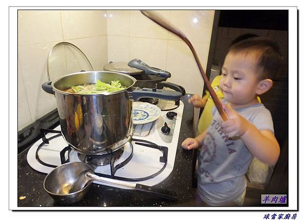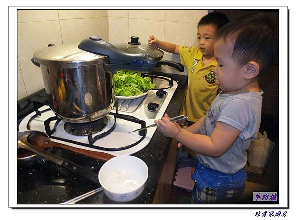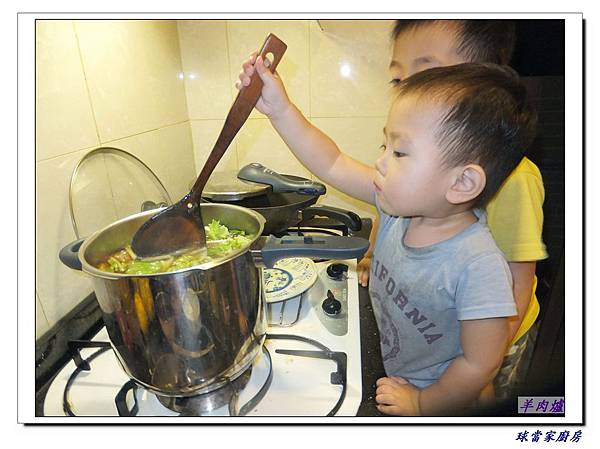 這時候我已經沒有再開火了,利用快鍋的高餘熱把青菜跟豆皮煮熟。我買的豆皮是炸的豆皮,不需要煮很久的那種厚豆皮。是一遇熱湯就軟掉的那種薄豆皮。是不需要在開瓦斯囉!森二很認真的在攪拌中~非常期待羊肉爐上桌呢!