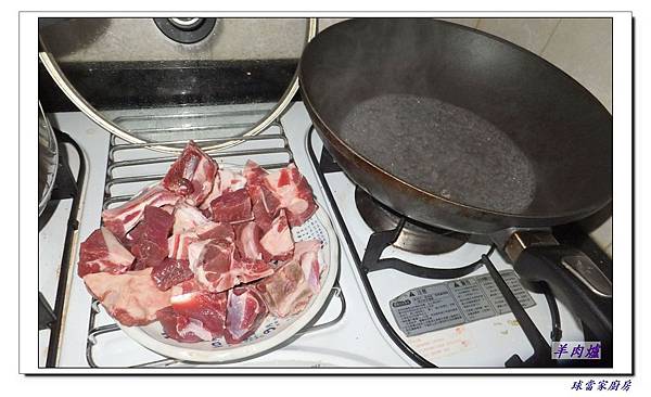 好了,首先先來川燙羊肉吧!咦,不是要用WMF,怎麼出場的不一樣?好吧~是這樣的~這支是WOLL鑽石炒鍋,川燙而已嘛!不用拿快鍋....(汗)。水滾之後,把羊肉倒入就可以關火了。WOLL的鑽石鍋,是可以離火之後,還會繼續滾的好鍋具,所以為了省瓦斯,這個拿來炒菜也是很省瓦斯唷!總之,羊肉倒入稍微翻滾去血水後,就可以撈起來在旁邊等著用。