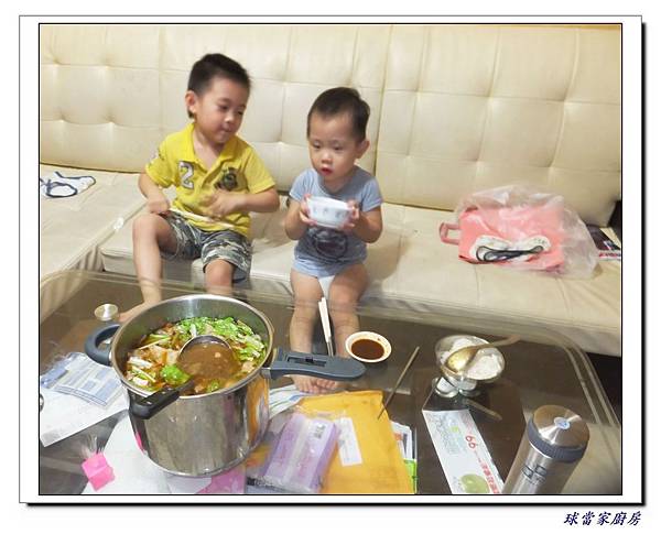 除了丟半顆高麗菜進去之外,還丟了凍豆腐、豆腐、玉米、金針菇、杏鮑菇還有少許的枸杞進去後順便調味一下,鍋蓋蓋起來後上壓一條線就關火等開鍋。等開鍋的時候,森二已經把剛剛的飯吃完了,碗裡剩下幾粒米飯。兩兄弟站在爐子前面等著最後一次開鍋就可以丟青菜跟豆皮煮,煮完就可以吃了~